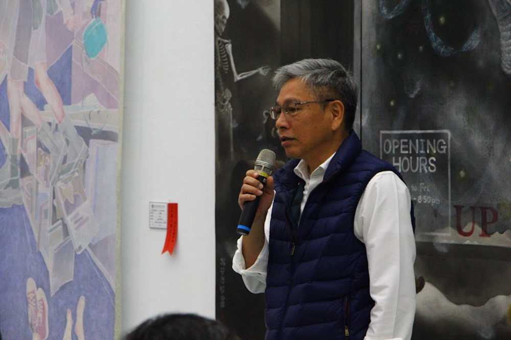 校長陳志誠致詞感謝同興營造公司,長期與書畫系簽訂贊助合約,支持該系教學獎勵優秀學生,也成為鼓勵創新創作的動力。