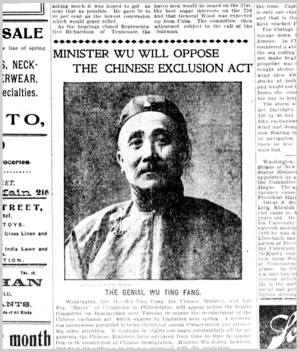 伍廷芳英文信函局部 國人多未備聞二零一一年十月六日,美國參議院 (United States Senate) 通過決議,對一八八二年美國 「排華法案」(Chinese Exclusion Act) 以及其他歧視中國種族法案,表達遺憾。「決議」 由參議員斯科特‧布朗 (Senator Scott Brown) 提案。至二零一二年六月十八日,美國眾議院 (United States House of Representatives) 復通過決議,對一八八二年美國 「排華法案」(Chinese Exclusion Act) 以及其他歧視中國種族法案,表達遺憾。「決議」 則由首位華裔國會眾議員趙美心女士 (Congresswoman Judy Chu) 提案,全名 「排華法案遺憾決議」(Resolution of Regret for Chinese Exclusion Act)。