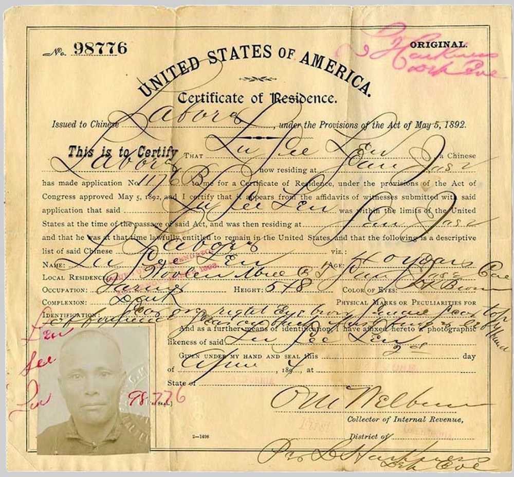 一八九四年頒發華人之居留證 又四年,一八九二年五月五日,即一八八二年 「排華法案」 期滿前一日,美國總統班傑明 ‧ 哈里森 (President Benjamin Harrison) 簽署 「吉利法案」(Geary Act),延續 「排華法案」 十年。「吉利法案」 勒令居美中國勞工平日須攜帶居留證,倘查獲未持居留證者,當予逮捕,懲處一年苦役後,驅逐出境。 再十年,一九零二年四月二十九日,即一八九二年 「吉利法案」 期滿前七日,美國總統狄奧多 ‧ 羅斯福 (President Theodore Roosevelt Jr.) 復簽署延續 「排華法案」 十年,並涵蓋夏威夷與菲律賓中國勞工。 後二年,一九零四年,美國國會更通過無限期延續 「排華法案」。 鑑此,知 「排華法案」 必因鉅大事故終止。