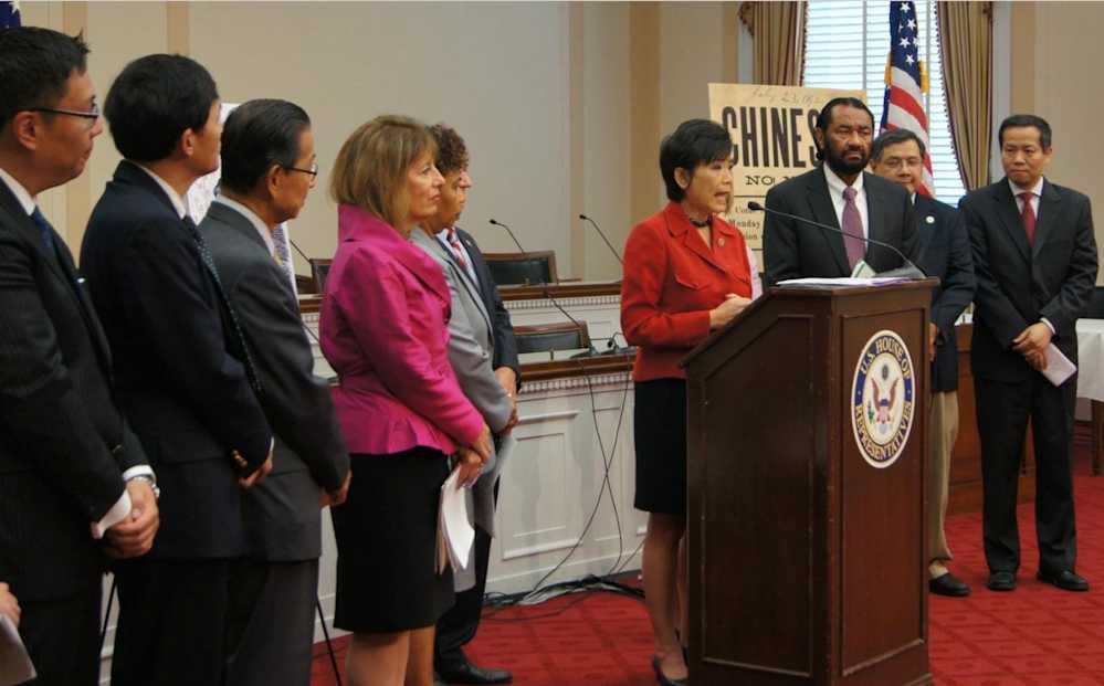二零一二年美國眾議員趙美心女士於記者會討論 「排華法案遺憾決議」。圖片來源:拉里 ‧ 品川先生 「排華法案」 初立,已一百四十一年前事。後經三次續案,竟延伸六十一年,至一九四三年方止。對照中國年號國號,則為光緒八年至民國三十二年。國人冒受逾一甲子種族歧視,屈辱難平,假 「排華法案遺憾決議」 終予昭雪,是以 「決議」 非僅華僑之大事,亦吾國民上下之大事也。 溯一八八二年五月六日,美國 「排華法案」 經國會通過,由總統切斯特 ‧ 艾倫 ‧ 亞瑟 (President Chester A. Arthur) 簽署立法。是案禁止中國勞工移民美國十年,為美國首次以種族原由禁止移民之法案。其勞工定義包含有技能與無技能兩類,固除少數具他種身分者,中國勞工幾無從進入美國。「法案」對居美中國勞工亦新設勒令,離美後倘欲返美,須再度申請許可,一概不允入籍美國,而法庭委權驅逐滯美中國勞工出境云。
