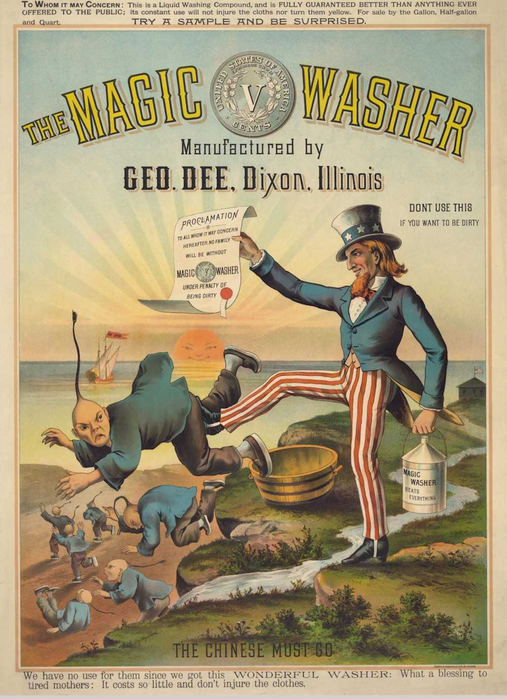一八八六年美國排華海報 越六年,一八八八年十月一日,美國總統史蒂芬 ‧ 格羅弗 ‧ 克里夫蘭 (President Stephen Grover Cleveland) 復簽署 「斯科茨法案」(Scott Act),禁止中國勞工離境,已離境之中國勞工則禁止返美,遂使二萬至三萬中國勞工無法返回美國居所。