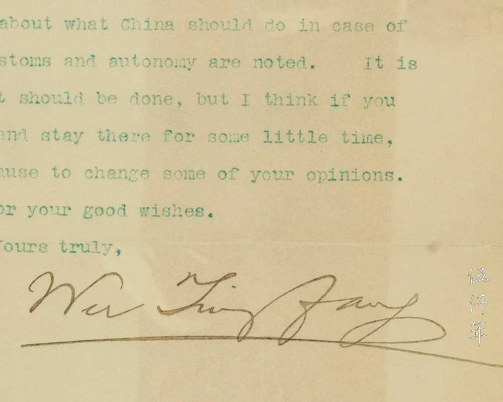 伍廷芳欽差遺影 寒齋珍藏一通駐美欽差大臣伍廷芳致美國排華作家伊薩克.諾伊斯 (Issac Pitman Noyes) 英文討讁信函,誠可貴也。伍廷芳乃名外交家,其演講與文章皆負盛譽於美。是信作於光緒二十八年,西曆一九零二年十一月十一日。前七箇月,四月二十九日,美國總統狄奧多.羅斯福方簽署延續 「排華法案」 十年。伍廷芳此刻論排華事,其憤懣見於文字。 伍廷芳英文信函次頁 信之譯文曰: 「一九零二年十一月十一日。 伊薩克.諾伊斯先生, 四零九號第四街東南區, 城市 (華盛頓) 敬啟者: 昨日奉接來函,驚悉前通覆函,仍未收到,余嘗命秘書覆函。 汝言甚善,人無法對每件事物意見相合,而必存分歧。然余意人若嗜正義、好公理,應力伸其旨。 至於貴國排斥中國人一事,汝所持主張與吾民背馳。此事若真遵照貴國對待全體人民之政策及公義標準,絕無怨言。余更謂若貴國多數人民,斷言某國移民將侵害國家利益,縱見解錯誤,卻擬定禁令,拒絕某國移民入境,祇需禁令正當,合理執行,當無從提出異議。然以中國人為例,並非如此。中國人被指摘之真正原由出自善良性格。汝亦嘗承認其他國家之移民,對貴國侵害尤過之,卻未見施以禁令。公義安在? 法律若普及應用於全體人民,情況自不相同。 汝言及中國風俗與自主凡遭侵犯應有之舉措,余亦知曉。「應有之舉措」 僅憑說辭,何其容易。余深信汝若前往中國,居留稍許時日,必能於短期內領悟出改變部分原先主張之理由。 並謝祝辭。 真誠之伍廷芳。」 伍廷芳 (一八四二至一九二二),字文爵,號秩庸,廣東新會人。生新加坡,四歲歸國,咸豐十一年 (一八六一年),肄業香港聖保羅書院。與友辦 「中外新報」,同治十三年 (一八七四年) 留學英國,入林肯法律學院習法學,三年後畢業返港,任律師、法官暨議員。光緒八年 (一八八二年),李鴻章聞名招致,入其幕府。光緒二十二年 (一八九六年),任駐美國、西班牙、秘魯欽差大臣,光緒二十八年 (一九零二年) 歸國,任修訂法律大臣,前清凌遲、連坐、刑訊等條律皆汰去,開刑法新紀元。 又任會辦商務大臣、外務部右侍郎。光緒三十三年 (一九零七年),復任駐美國、黑西哥、秘魯、古巴欽差大臣。宣統三年 (一九一一年) 十月武昌起義,贊同共和體制。民國元年 (一九一二年) 元月,任臨時政府司法部總長。同年四月,授駐美國首席大臣,未上任。民國五年 (一九一六年),任北洋政府外交部總長,民國七年 (一九一八年),任廣東南方政府外交部部長。民國十一年 (一九二二年),國父孫中山任命廣東省省長。著 「一位東方外交官眼中之美國」(America through the Spectacles of an Oriental Diplomat) 等。
