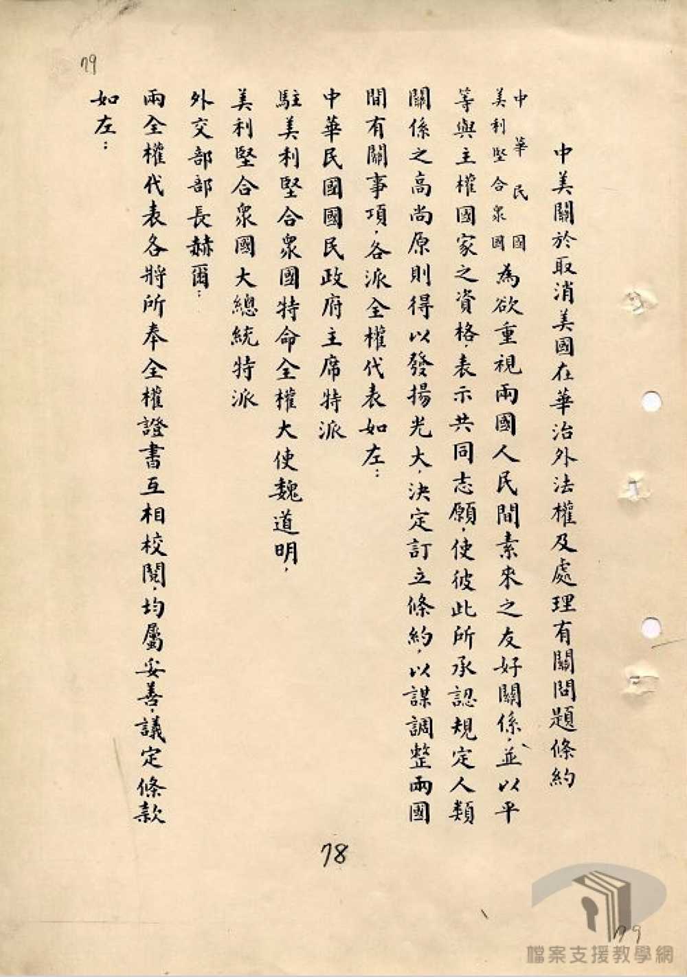 「中美關於取消美國在華治外法權及處理有關問題條約」首頁 民國二十六年 (一九三七年) 七月七日盧溝橋事變,抗日戰爭爆發,先總統蔣介石先生領導全國軍民抵抗日本侵略。抗戰第四年,民國三十年 (一九四一年) 十二月七日,日本偷襲美國珍珠港,次日,美國對日本宣戰,中華民國與美國遂成盟友。既為盟友,一九四三年一月十一日,中華民國與美國簽署 「中美關於取消美國在華治外法權及處理有關問題條約」(Treaty between the United States and China for Relinquishment of Extraterritorial Rights in China and the Regulation of Related Matters),又稱 「中美平等新約」。中國繼與各國廢除前清所遺之不平等條約。同年十二月十七日,美國國會通過 「廢除排華法案」(The Repeal of the Chinese Exclusion Act),又稱 「馬格努森法案」(Magnuson Act)。美國雖允許國人移民,其名額僅每年一百零五人,生於美國境外之國人則允許申請入籍美國。 自一八八二年五月六日,美國通過 「排華法案」,至一九四三年十二月十七日,美國通過 「廢除排華法案」,洽正六十一年。昔之國人西渡重洋謀生,遘遇奇酷,困厄所迫耳。惟今,美國固早啟移民巨門,而國人移離大陸、香港、臺灣之浪潮猶未可遏止! 竊思一日大陸克逮民權民生之境地,千萬國人豈願心力交瘁移民異邦? 美國排華六十一年間,亦見少數國人與洋人嚴辭批駁,筆伐口誅,正義之聲未盡於時。