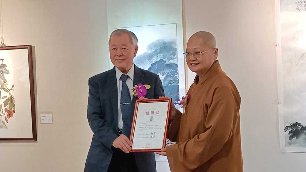蘇峯男致贈水墨畫作〈碧池清影不染塵〉美術館收藏,滿謙法師並頒贈感謝狀。