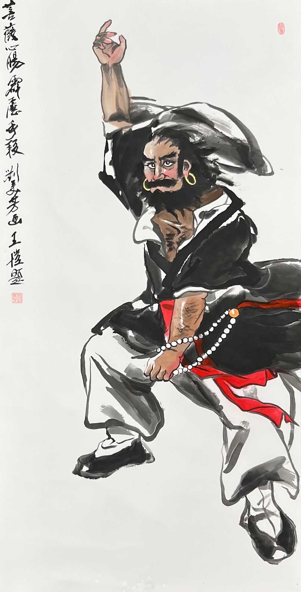 張富貴以篆、行草創作的《心經》書法作品,結 合花青淡墨背景與金線菩薩像,展現「心無罣礙」的禪意核心;劉美芳議員亦以《禪心無痕》與《貴妃醉酒》兩幅風格迥異之作,體現她對禪宗修為與古典仕女情境的藝術詮釋。前者氣勢磅礴,後者婉約細膩,風格兼容並蓄,展現其藝術創作的深度與多元性。 劉寳玉的《禪悅》則以濟公禪師形象傳達修行的自在與慈悲,畫中鞋履遺落的細節,寓意放下執念,回歸本心,獲得無拘之樂。 本次展覽不僅為藝文愛好者提供高品質的視覺饗宴,更體現了藝術與心靈的深度交會。陳文慧老師的悉心栽培與引領,正是讓學員能夠由技入道、由畫修心的關鍵推手,展覽亦見證其多年耕耘之成果。