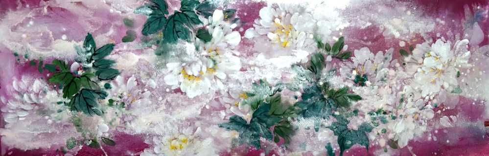 主題為「花弄影」的創作個展是畫家陳文慧從事水墨創作多年的一次綜合展示,近年結合膠彩畫媒材與水墨花卉的造型語言,重新詮釋心中的花鳥繪畫。